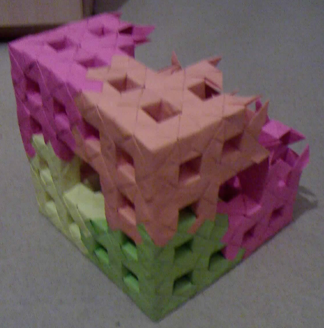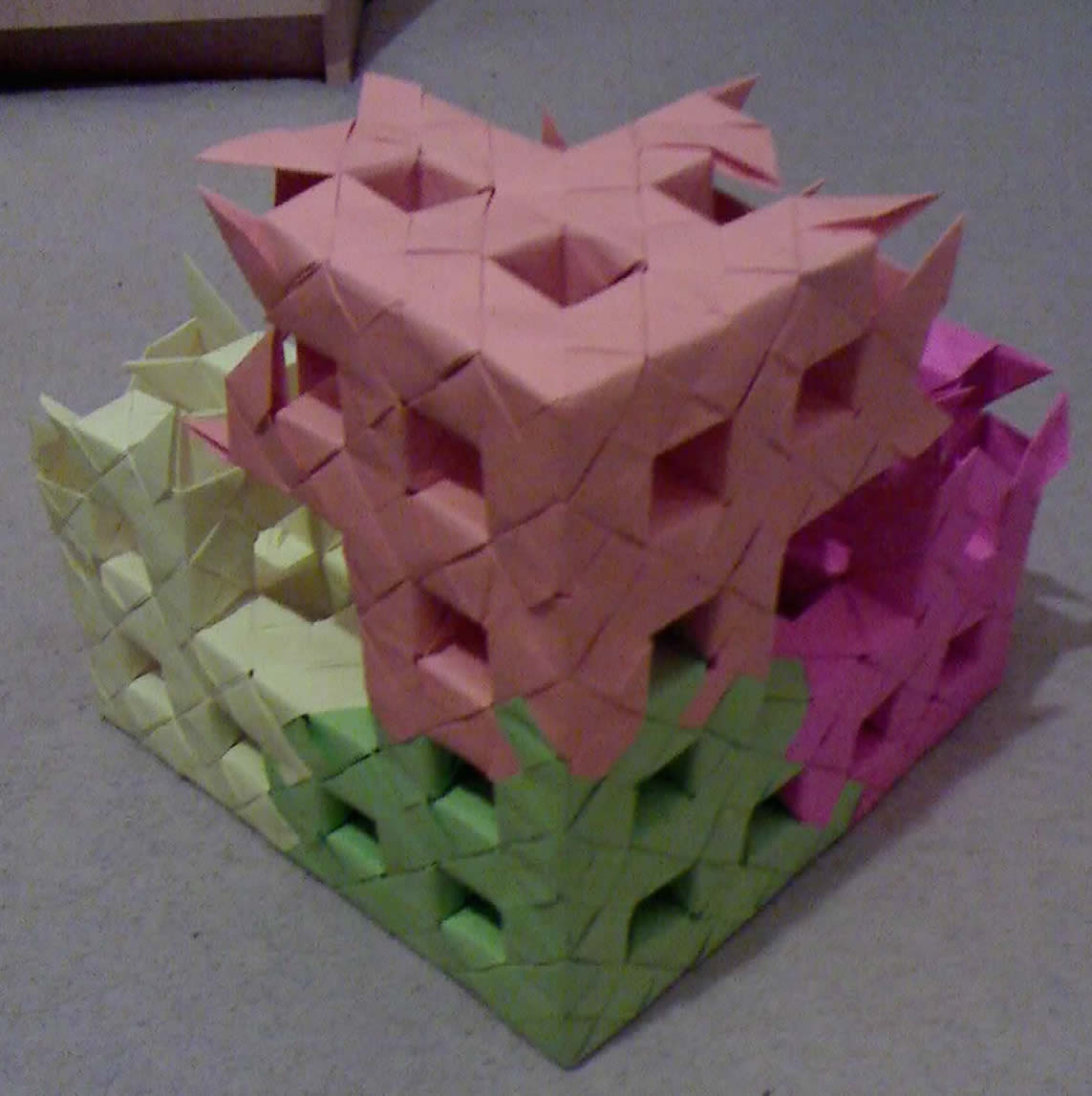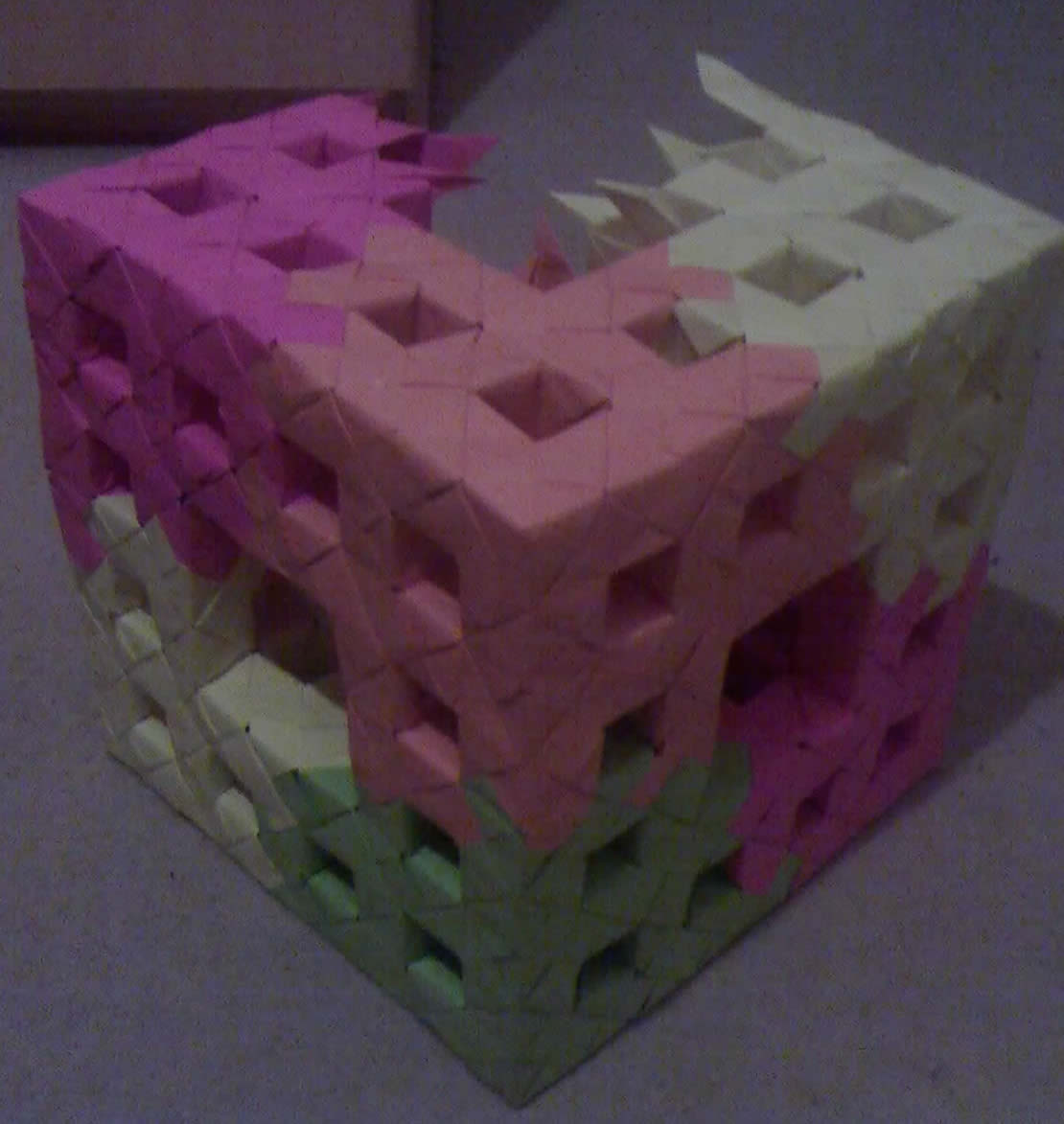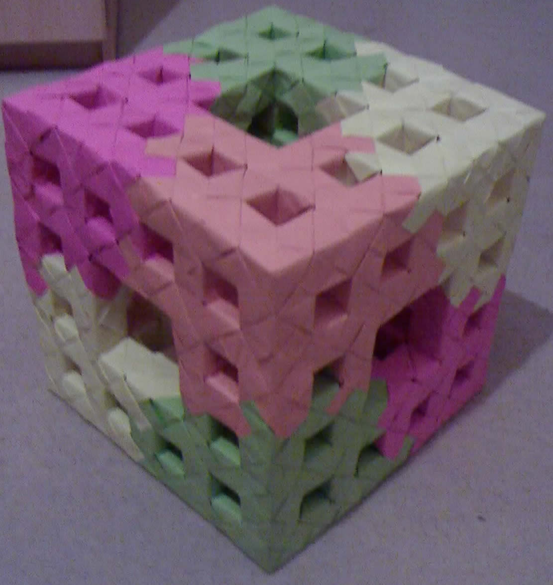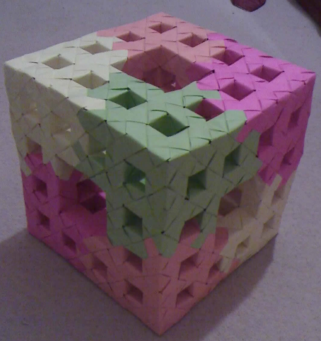 One of my previous projects involved the use of 1152 squares of paper to build a Level 2 Variant 12 Menger Sponge. In this case, there were 4 colours of brightly coloured post-it notes. It is currently 100% complete.