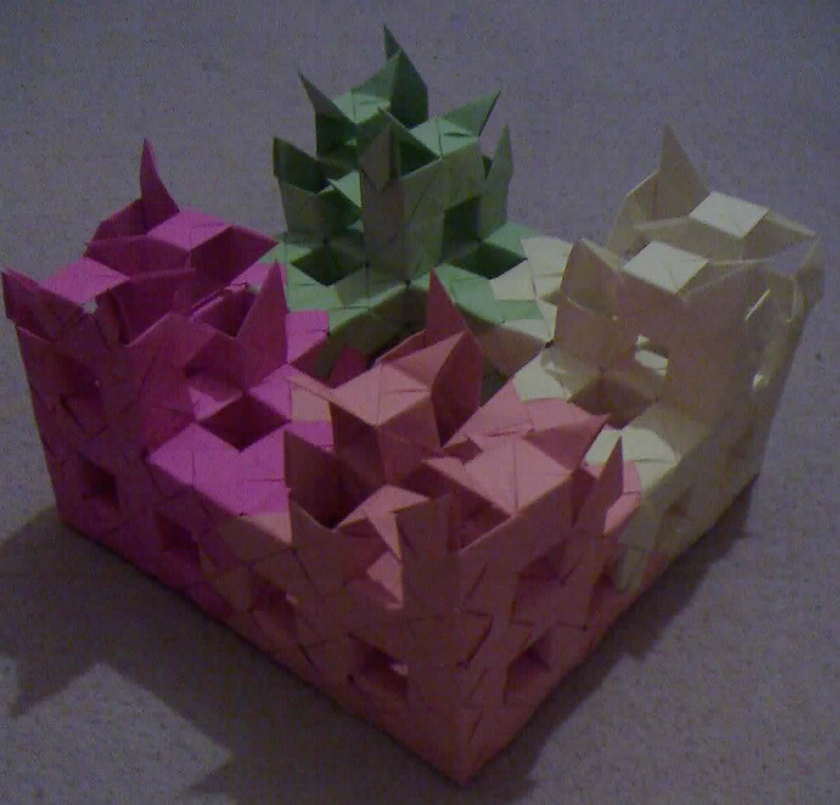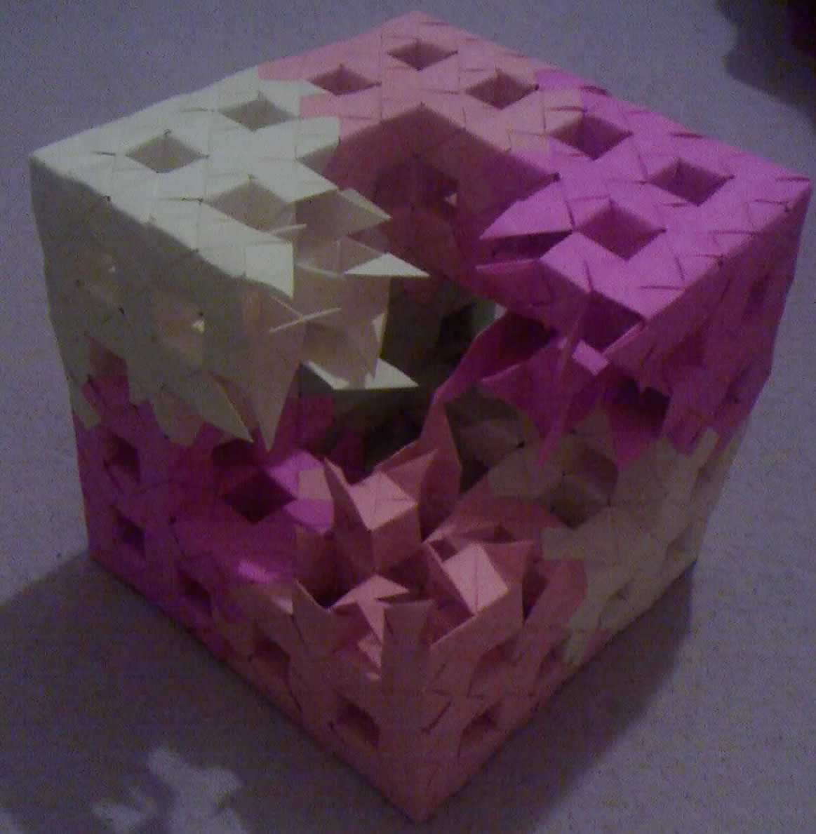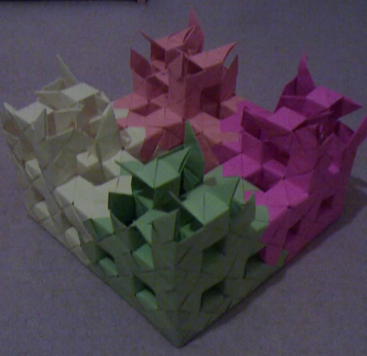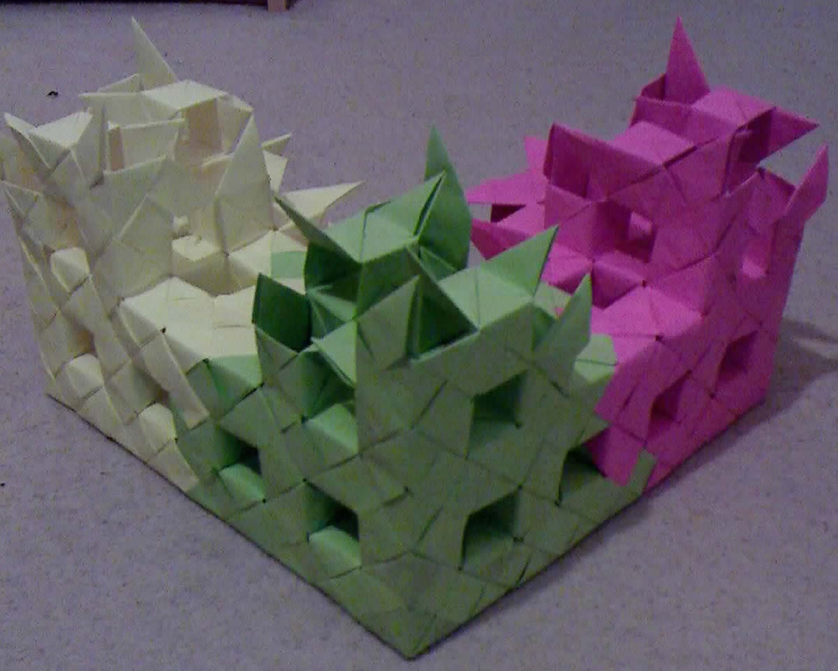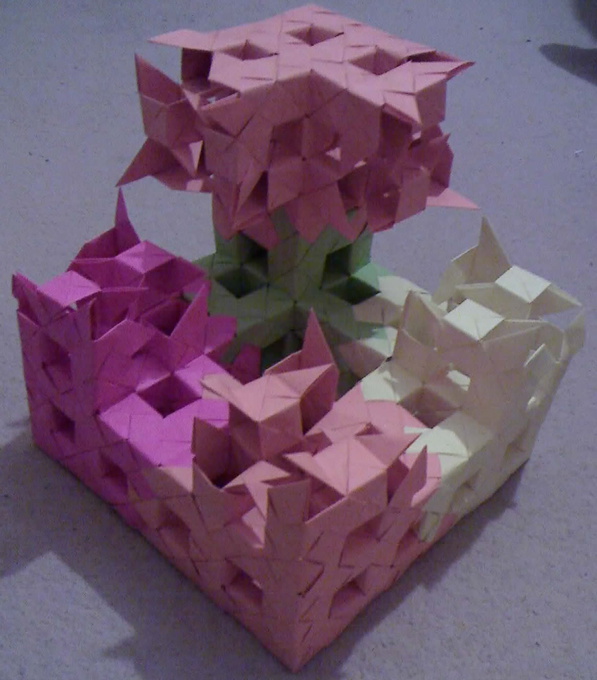 One of my previous projects involved the use of 1152 squares of paper to build a Level 2 Variant 12 Menger Sponge. In this case, there were 4 colours of brightly coloured post-it notes. It is currently 100% complete.