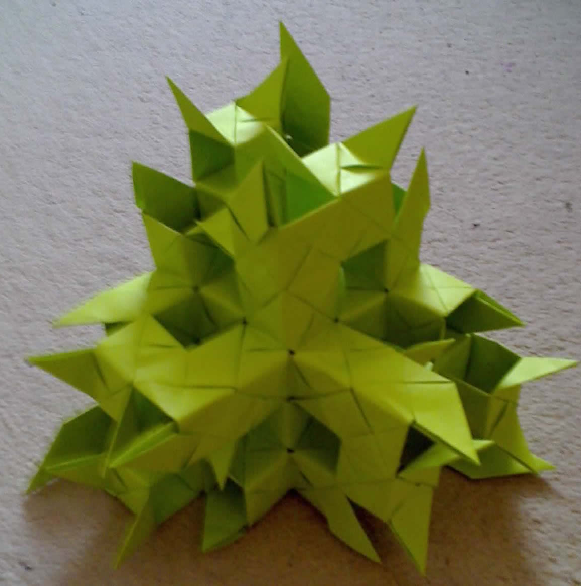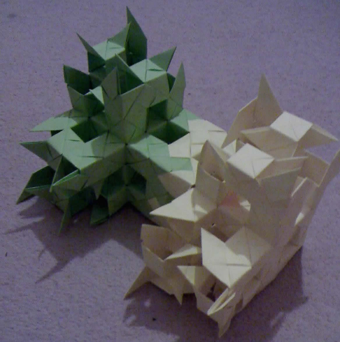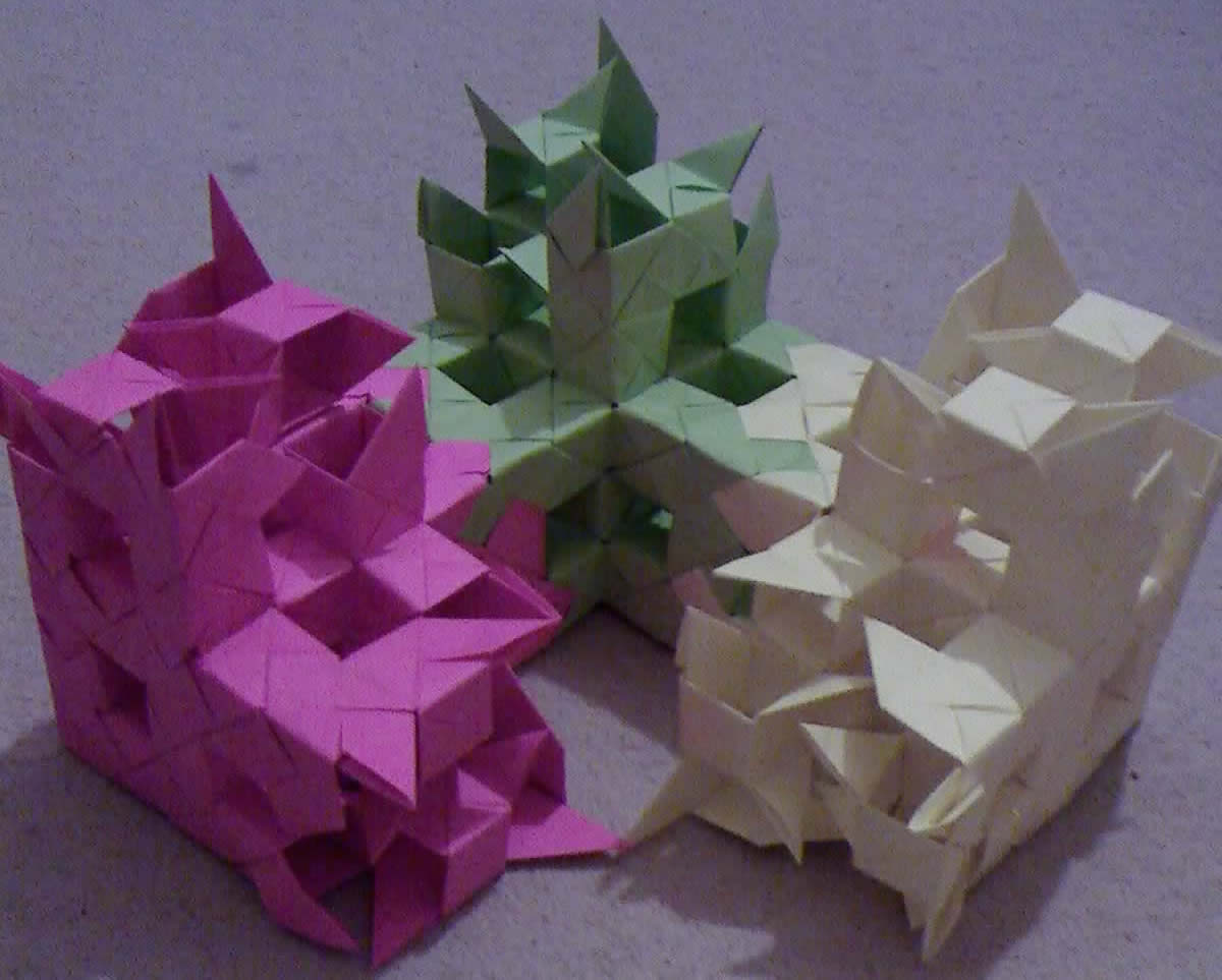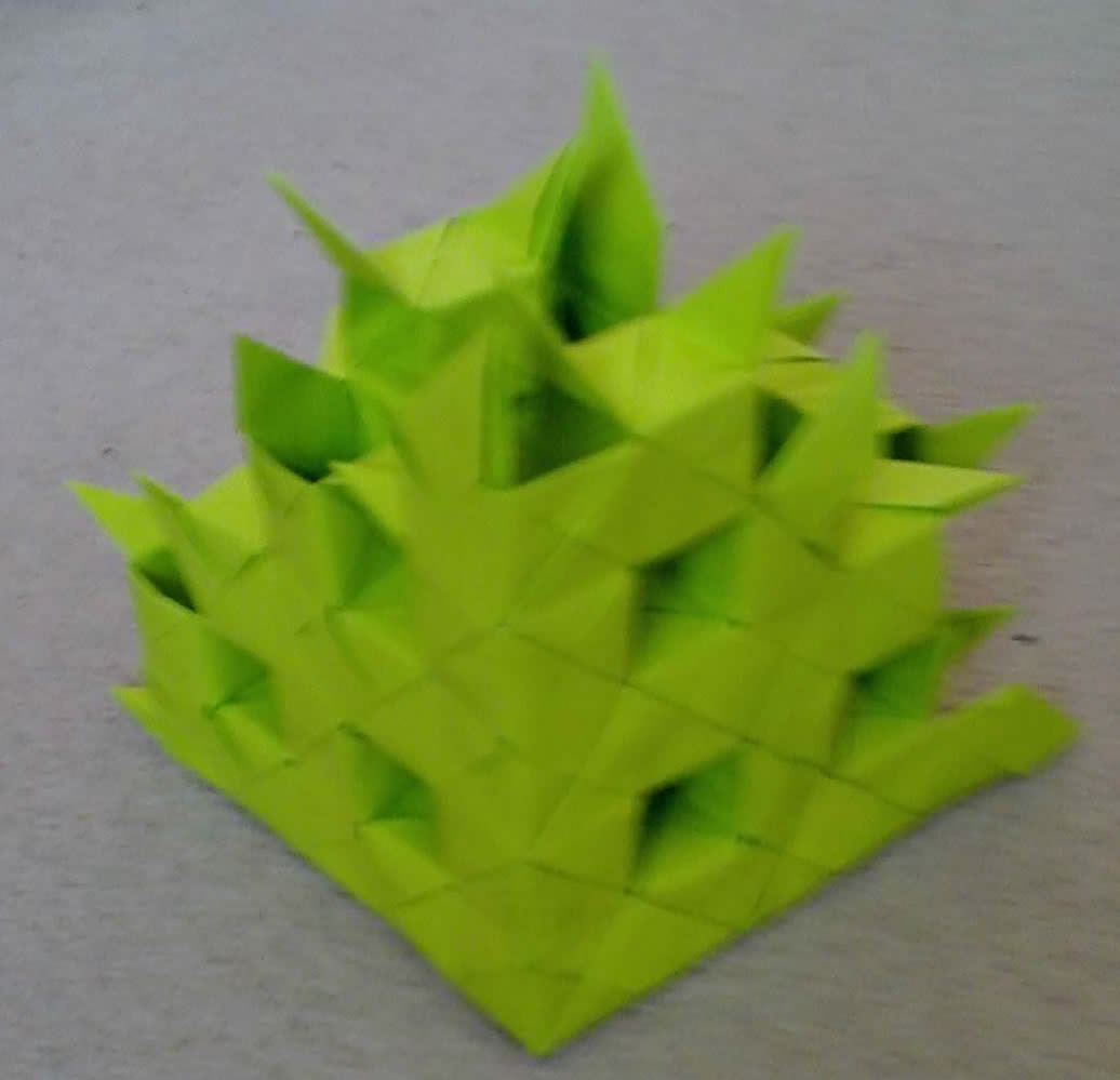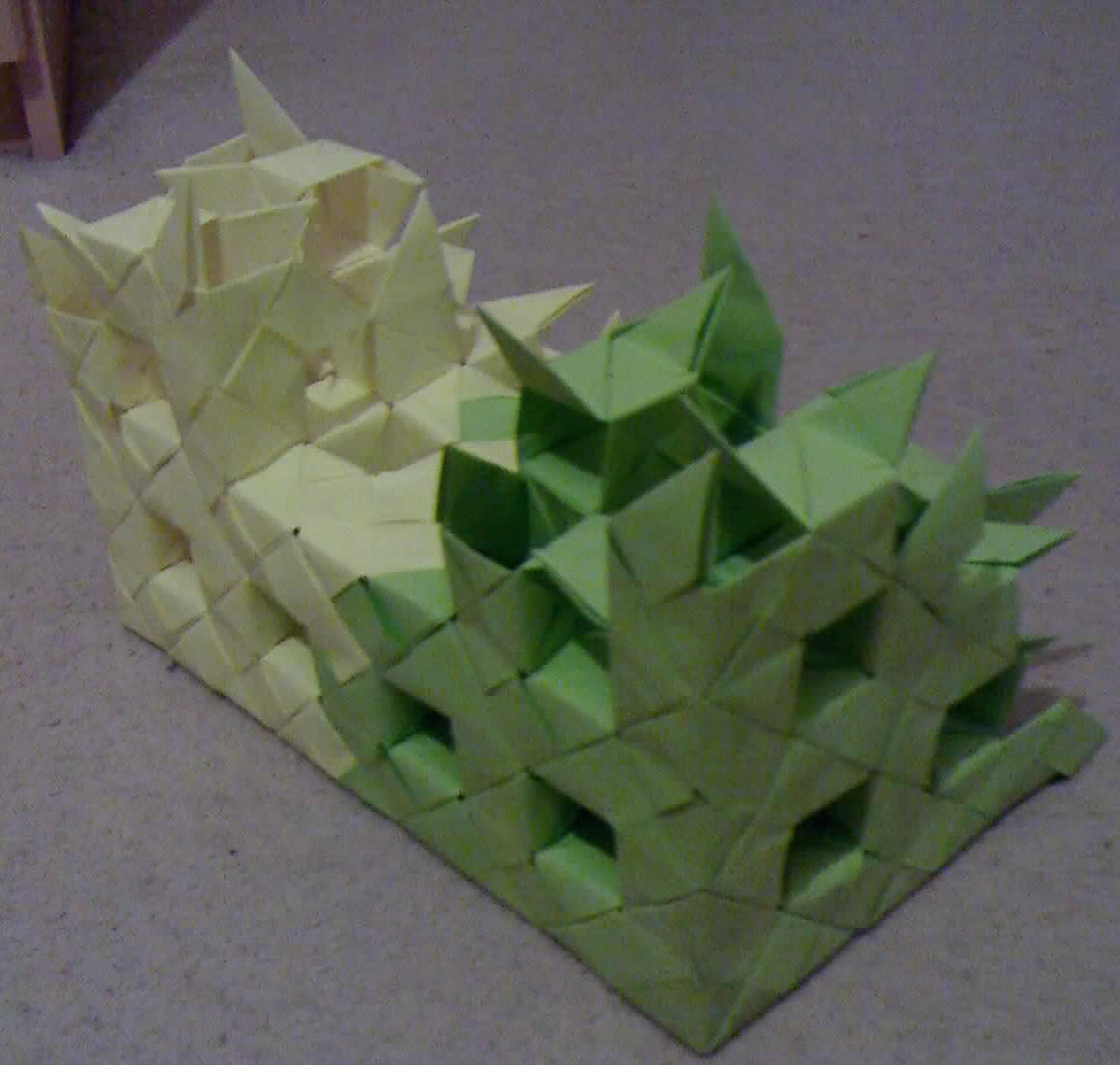 One of my previous projects involved the use of 1152 squares of paper to build a Level 2 Variant 12 Menger Sponge. In this case, there were 4 colours of brightly coloured post-it notes. It is currently 100% complete.